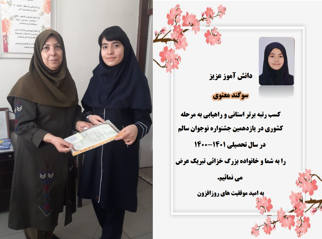 خداوند سبحان را شاکریم که در سایه اهتمام، تلاش، تدبیر و برنامه ریزی علمی دانش آموزان و دبیران پرتلاش و دل سوز دبیرستان خزایی توانستیم موفقیت دیگری را رقم بزنیم. با افتخار فراوان درخشش موفقیت دانش آموزان عزیز آرمیتا احمدیان ، یاسمین ولی ، کیمیا امینی در آزمون تیزهوشان را به تمامی این دانش آموزان پرتلاش و خانواده بزرگوار آنان تبریک عرض می نماییم.
