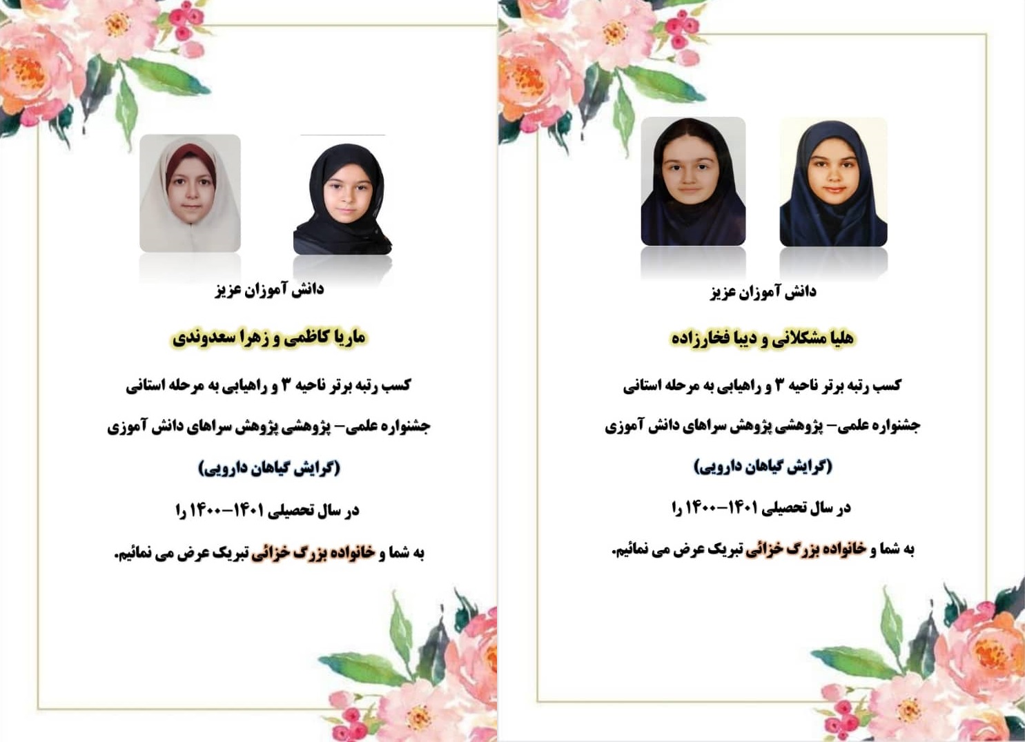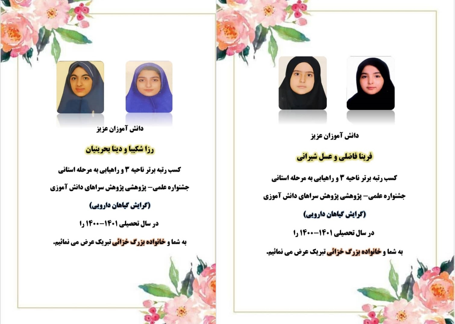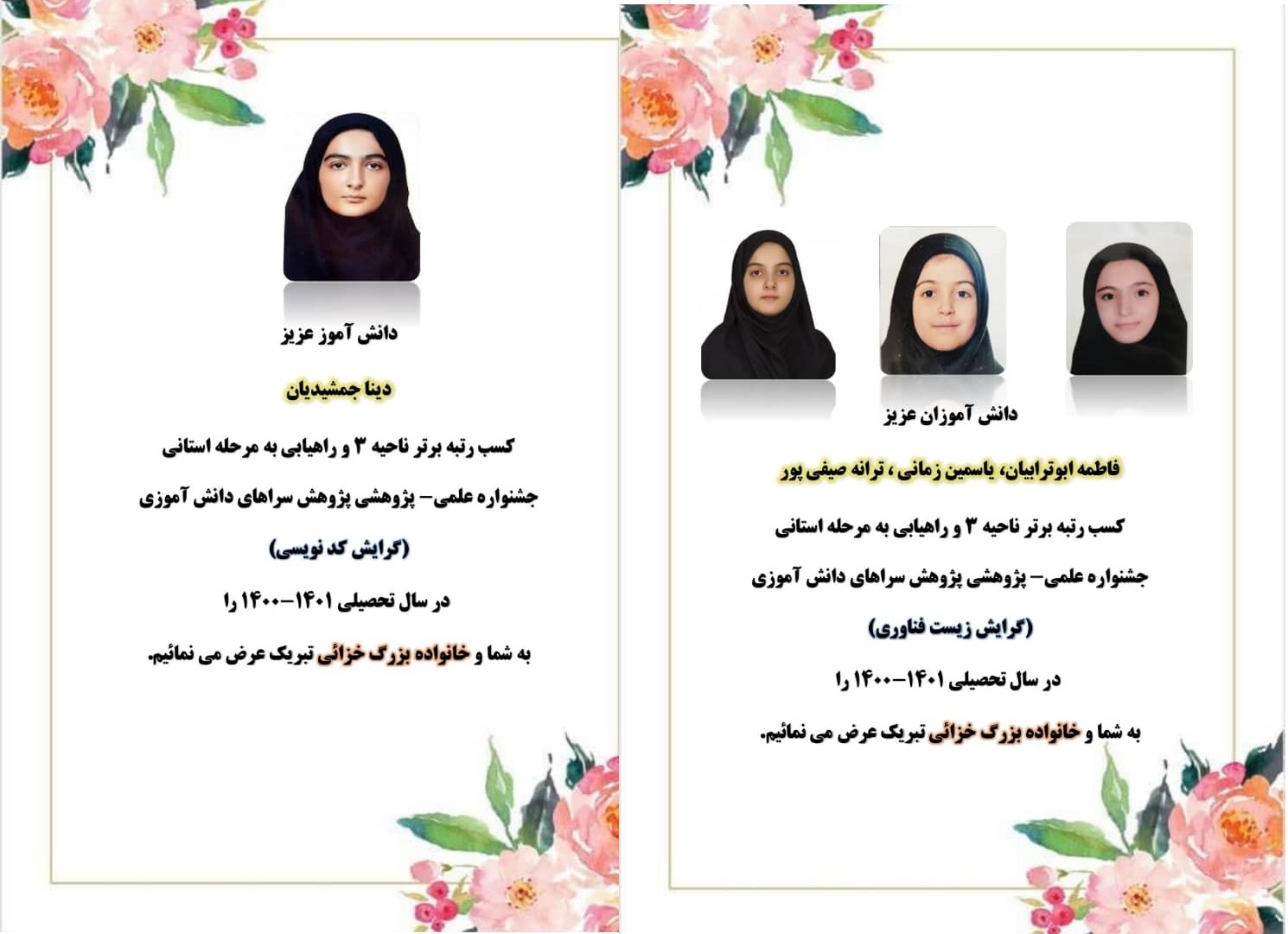 خداوند سبحان را شاکریم که در سایه اهتمام، تلاش، تدبیر و برنامه ریزی علمی دانش آموزان و دبیران پرتلاش و دل سوز دبیرستان خزایی توانستیم موفقیت دیگری را رقم بزنیم. با افتخار فراوان درخشش موفقیت دانش آموزان عزیز آرمیتا احمدیان ، یاسمین ولی ، کیمیا امینی در آزمون تیزهوشان را به تمامی این دانش آموزان پرتلاش و خانواده بزرگوار آنان تبریک عرض می نماییم.