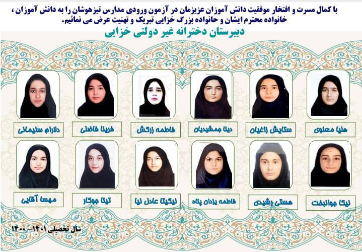خداوند سبحان را شاکریم که در سایه اهتمام، تلاش، تدبیر و برنامه ریزی علمی دانش آموزان و دبیران پرتلاش و دل سوز دبیرستان خزایی توانستیم موفقیت دیگری را رقم بزنیم. با افتخار فراوان درخشش موفقیت دانش آموزان عزیز آرمیتا احمدیان ، یاسمین ولی ، کیمیا امینی در آزمون تیزهوشان را به تمامی این دانش آموزان پرتلاش و خانواده بزرگوار آنان تبریک عرض می نماییم.
